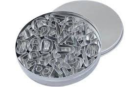 Stainless steel alphabet cutters for creating letter-shaped decorations in cookie dough, fondant, gum paste, and chocolate. Complete A-Z letter set for personalising baked goods and cake decorations. Supplied in metal storage tin measuring 12 x 12 x 2cm. Hand wash only.