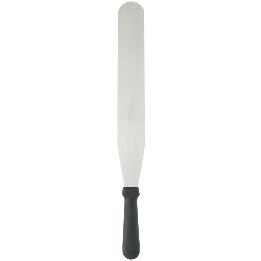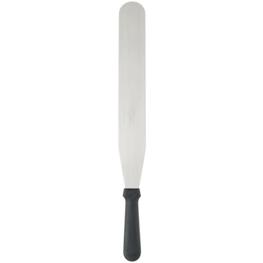 Stainless steel straight spatula with black plastic handle for cake icing, fondant application, and crepe batter spreading. The flat blade distributes mixture evenly without leaving ridges, suitable for frosting cakes, cupcakes, and pastry work. Shock-resistant plastic handle provides ergonomic grip and durability in commercial kitchens. Stainless steel blade resists bending, rusting, and dulling. Available in two sizes.