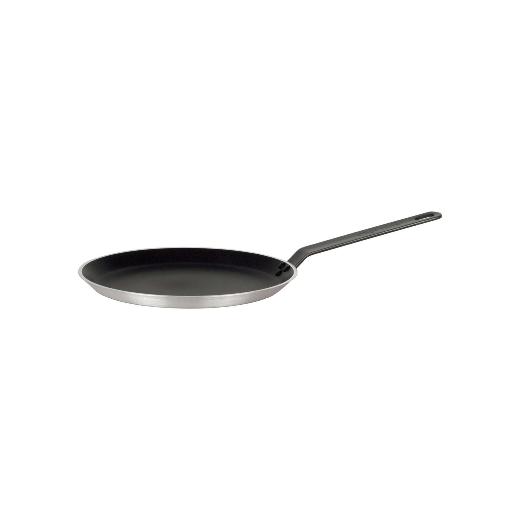 Aluminium crepe pan with 25cm diameter cooking surface and low sides for flipping crepes, pancakes, tortillas, and eggs. The 4mm gauge aluminium body ensures even heat distribution. Quantum 2 Whitford non-stick coating reduces oil requirements and simplifies cleanup. Ferritic stainless steel induction base compatible with induction, gas, electric, and halogen cooktops. Riveted epoxy-coated handle provides secure grip and stability. Oven-safe to 180°C for finishing dishes like frittatas.
