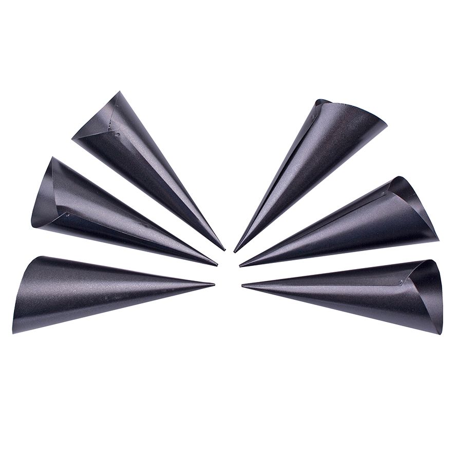 Set of six non-stick cream horn moulds for creating pastry cones and desserts. Wind sweet or savoury pastry dough around each mould, bake until golden, then fill with cream, fruit, jam, mousse, or cheese-based fillings. Non-stick coating facilitates easy release and cleanup. Stackable design suits compact storage.