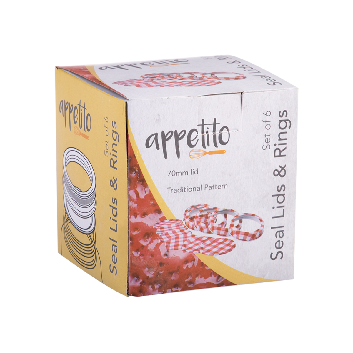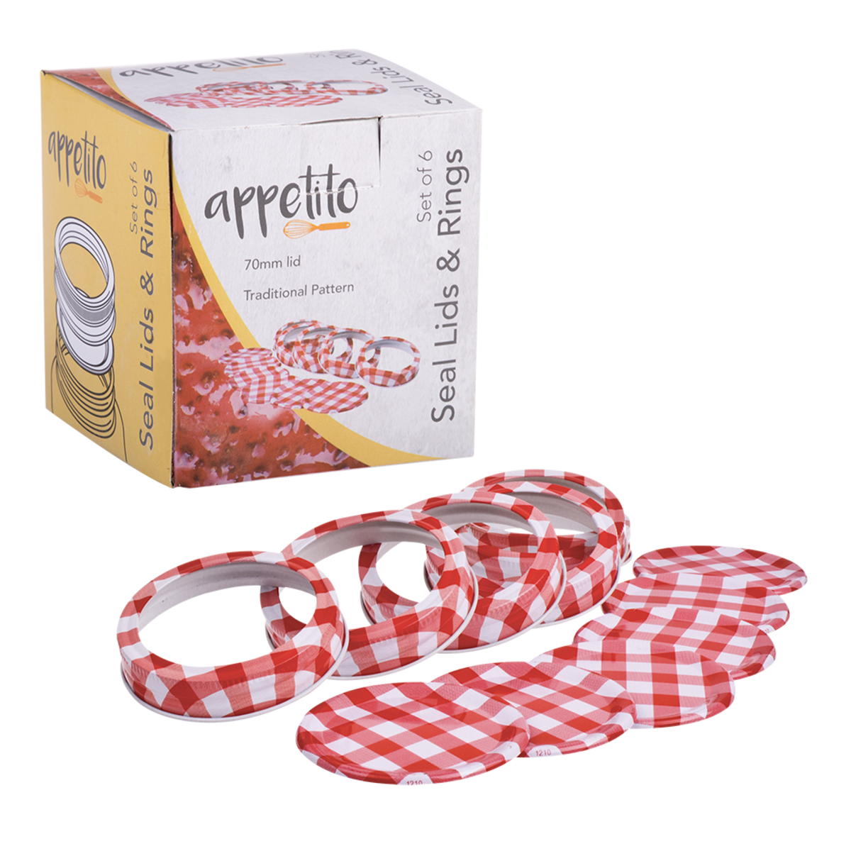 Securely preserve jams and other homemade goods with the Appetito Seal Lids and Rings. This set of 6 provides a reliable and attractive sealing solution for your mason jars.