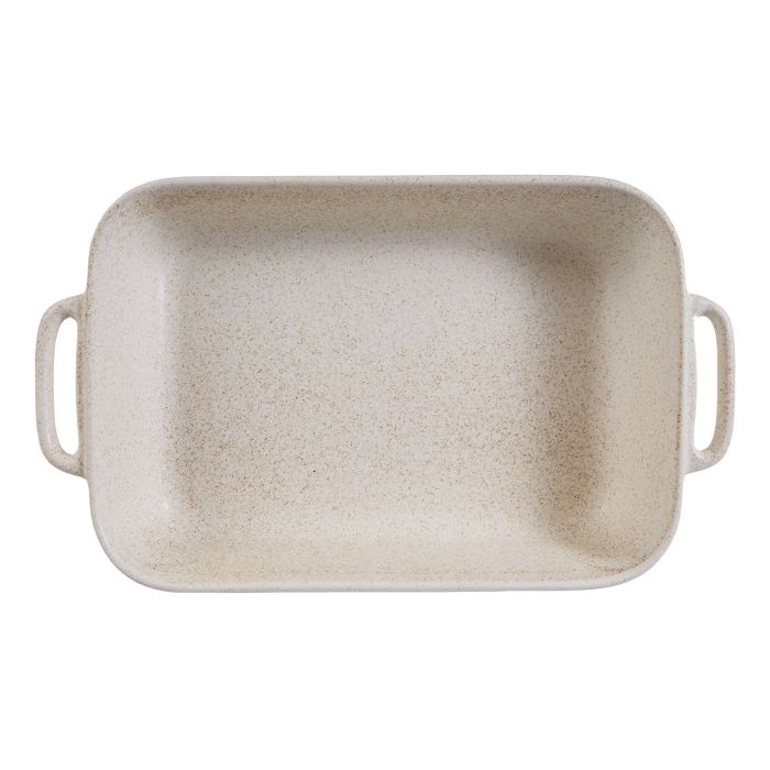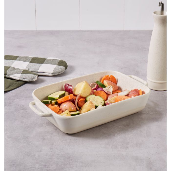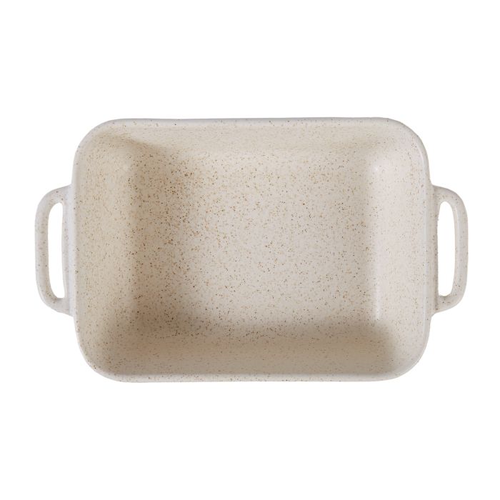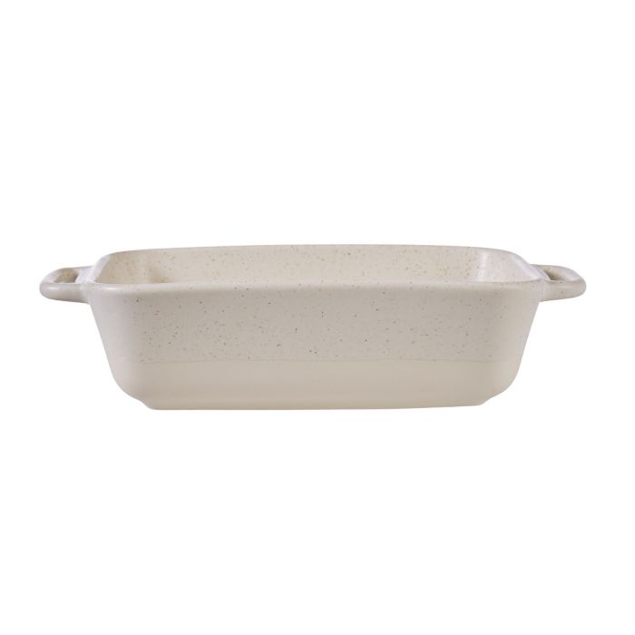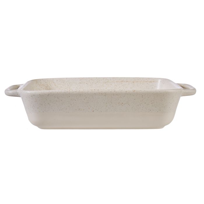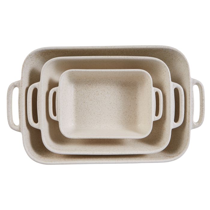 Three-piece stoneware baking set with cream speckled finish. Nested design for compact storage. Dishwasher safe.