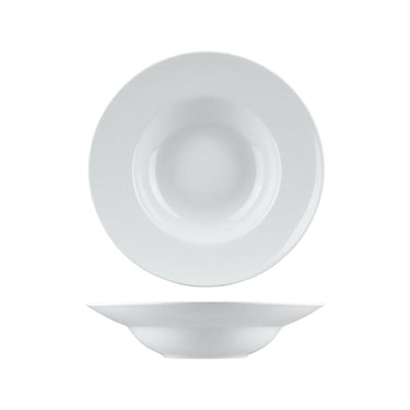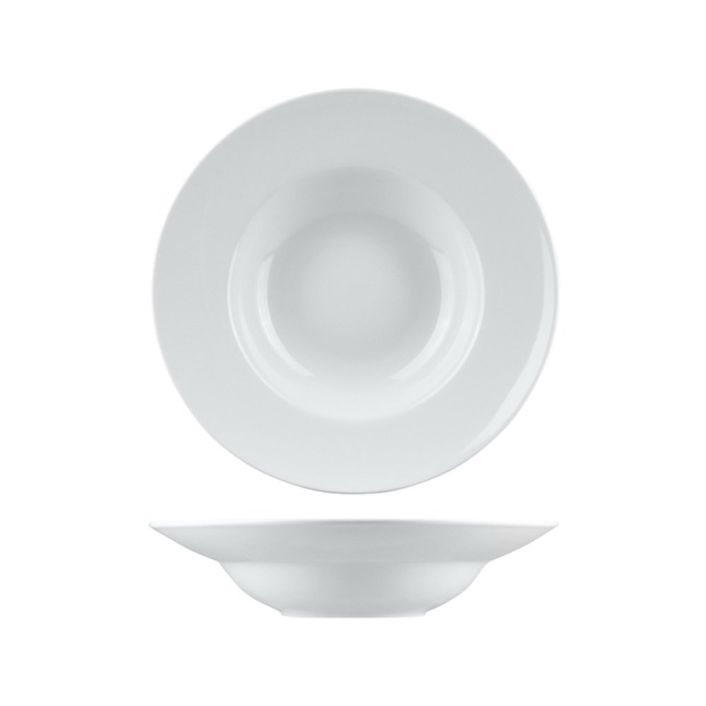 Wide-rimmed bowl suitable for soup and pasta service. 305mm outer diameter with 180mm inner well.