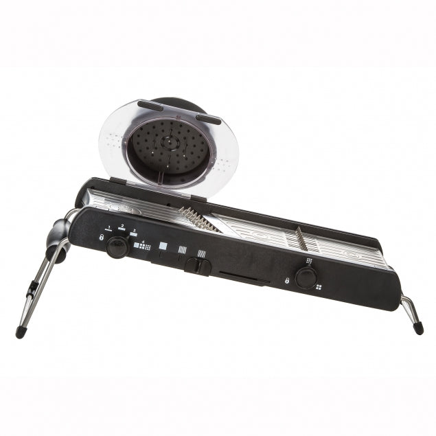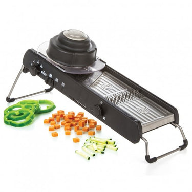 A professional-grade mandoline for efficient food preparation. Features adjustable slicing thicknesses, julienne, and cubing options. Integrated blades and a safety hand guard enhance usability.