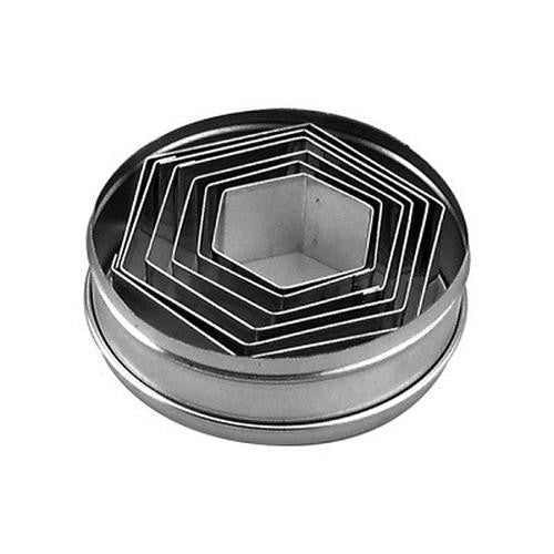 Professional hexagon-shaped cookie cutters for commercial kitchen use. Set includes six graduated sizes ranging from 45mm to 95mm diameter, suitable for cutting dough, pastry, and other food preparations. Tin construction provides durability for high-volume use. Dishwasher safe for easy cleaning in commercial environments.