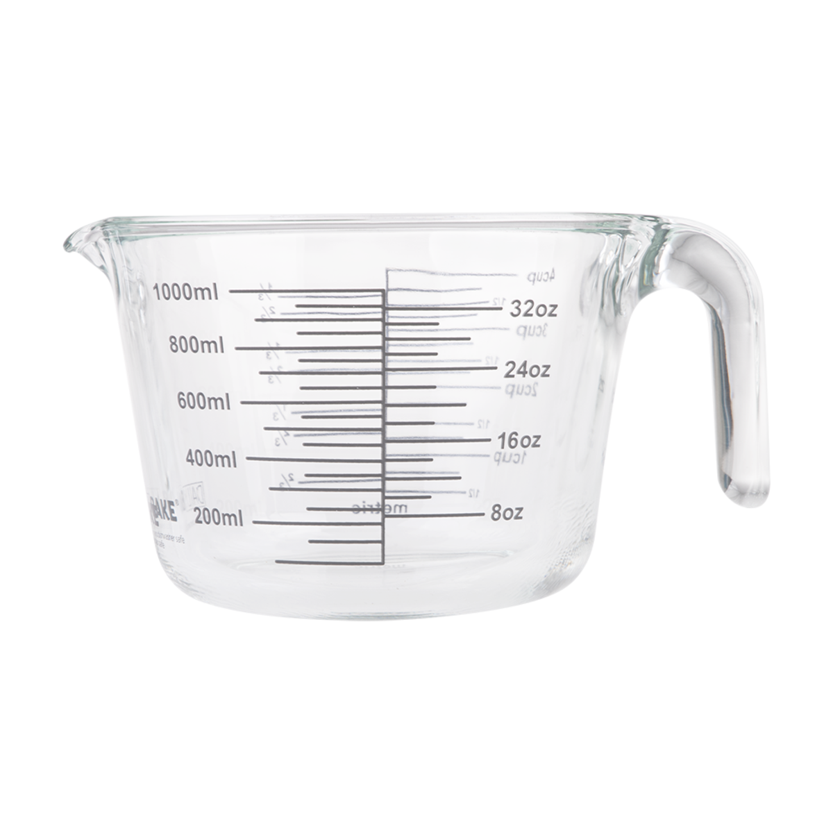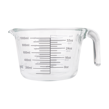 Borosilicate glass measuring jug with 1L (4 cup) capacity. Heat-resistant glass construction suitable for hot and cold liquids.