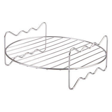 Round stainless steel rack for air fryer use. Elevates food to improve air circulation and enables dual-level cooking to maximise air fryer capacity.