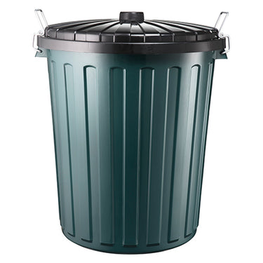 This bin is perfect for your garbage needs - it's 75 liters, has a plastic body, and comes with a green lid.