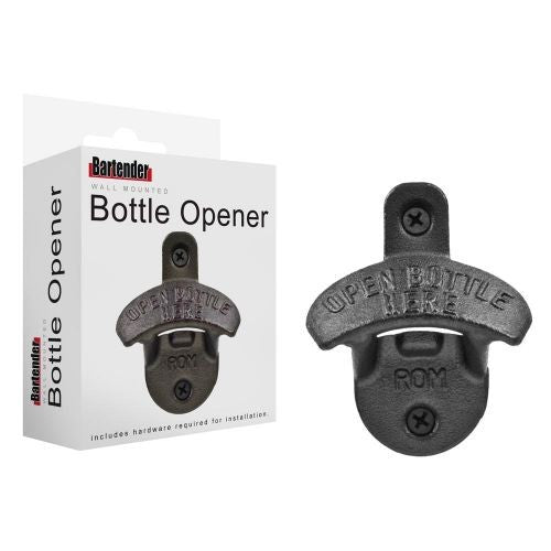 Rustic cast iron wall-mounted bottle opener perfect for outdoor entertaining areas. Durable construction with classic styling.